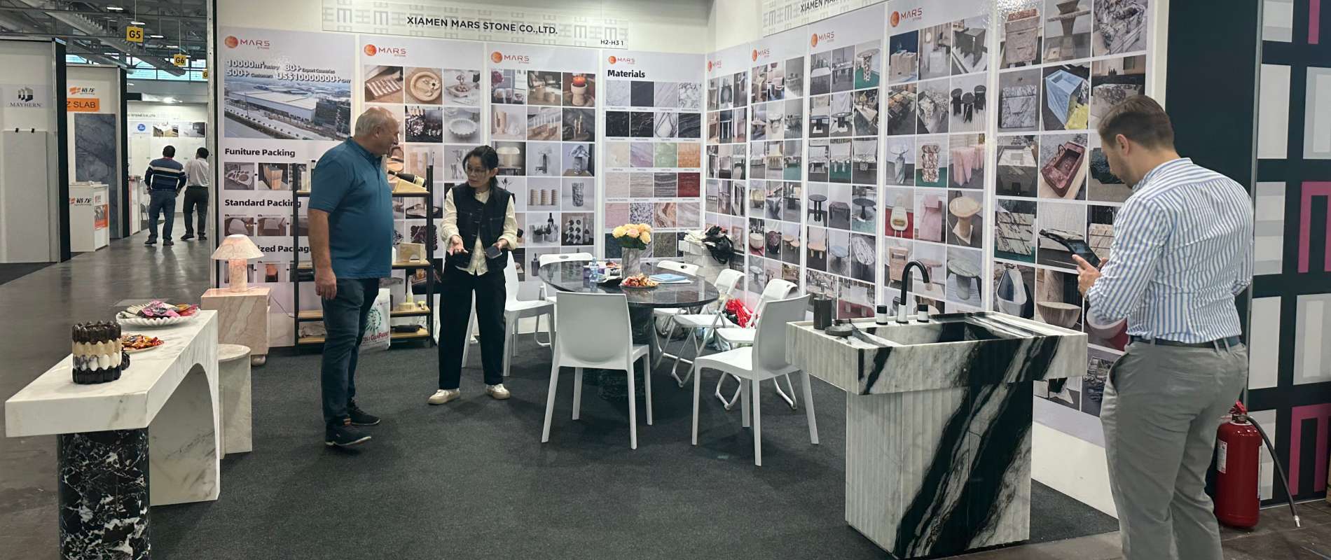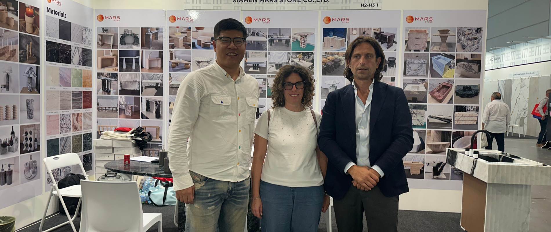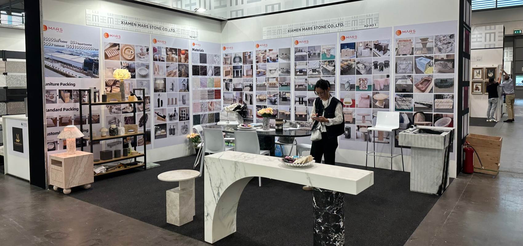 En la exposición, Marks Stone, bajo el lema "Estética Natural y Simbiosis Artesanal", presentó sus llamativos muebles y artesanías de mármol hechas a mano. Muebles como las mesas de comedor de mármol fueron pulidos y recortados a mano para preservar la textura natural de la piedra. Obras de arte, lámparas especiales y otras artesanías incorporaron formas talladas a mano y texturas artesanales, cada una representando una artesanía única. La marca también promueve el concepto de "Artesanía Ecológica", con ocho productos que recibieron la certificación LEED. Su "Solución de Personalización Artesanal" (que permite ajustes personalizados de las curvaturas de los muebles y los detalles artesanales) también ha sido reconocida.