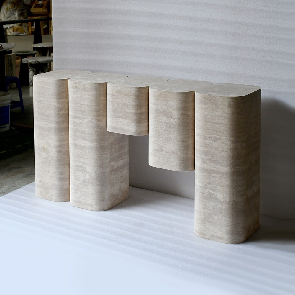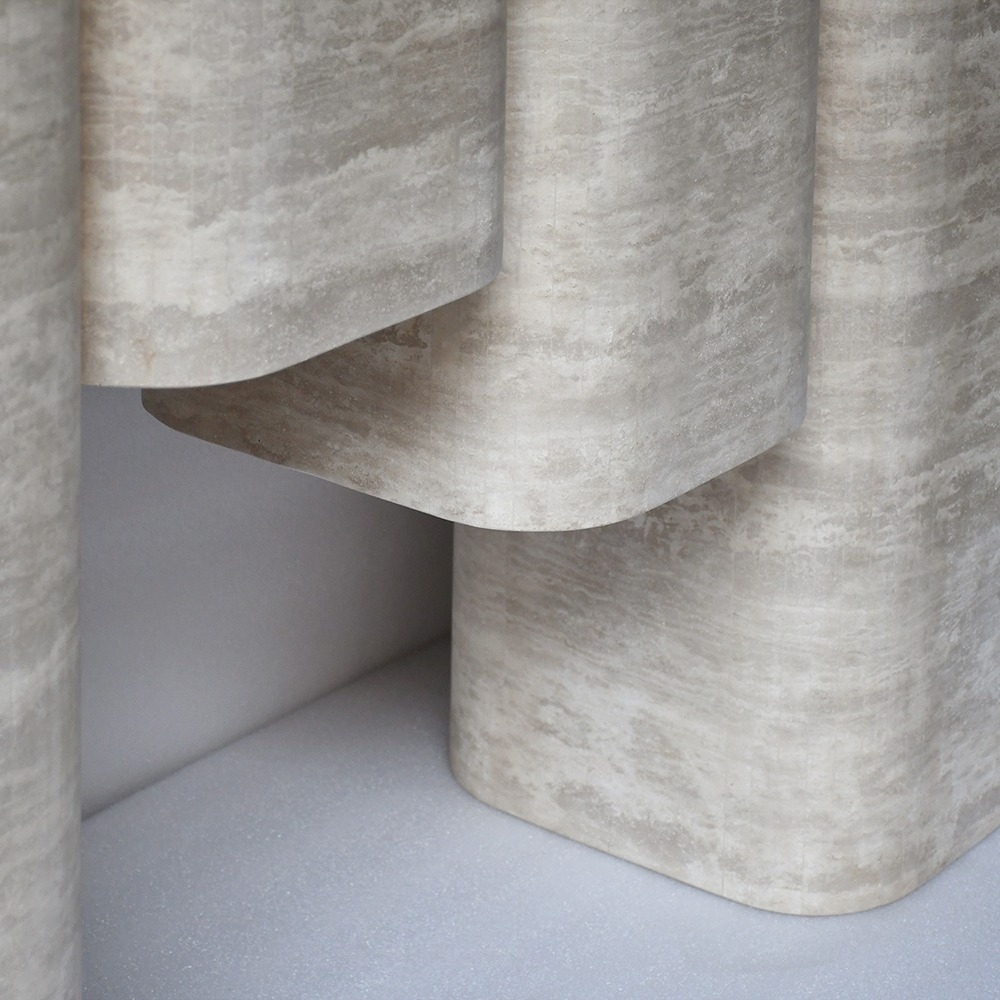 La característica distintiva de la mesa es su llamativa estructura escalonada y superpuesta: una serie de recortes rectangulares empotrados y anidados recorren la parte inferior del tablero y bajan por las patas verticales, creando una silueta arquitectónica tridimensional y rítmica. Los bordes verticales estriados de las patas exteriores amplifican la profundidad textural, transformando un soporte funcional en una obra de arte escultórica que juega con la luz y la sombra.